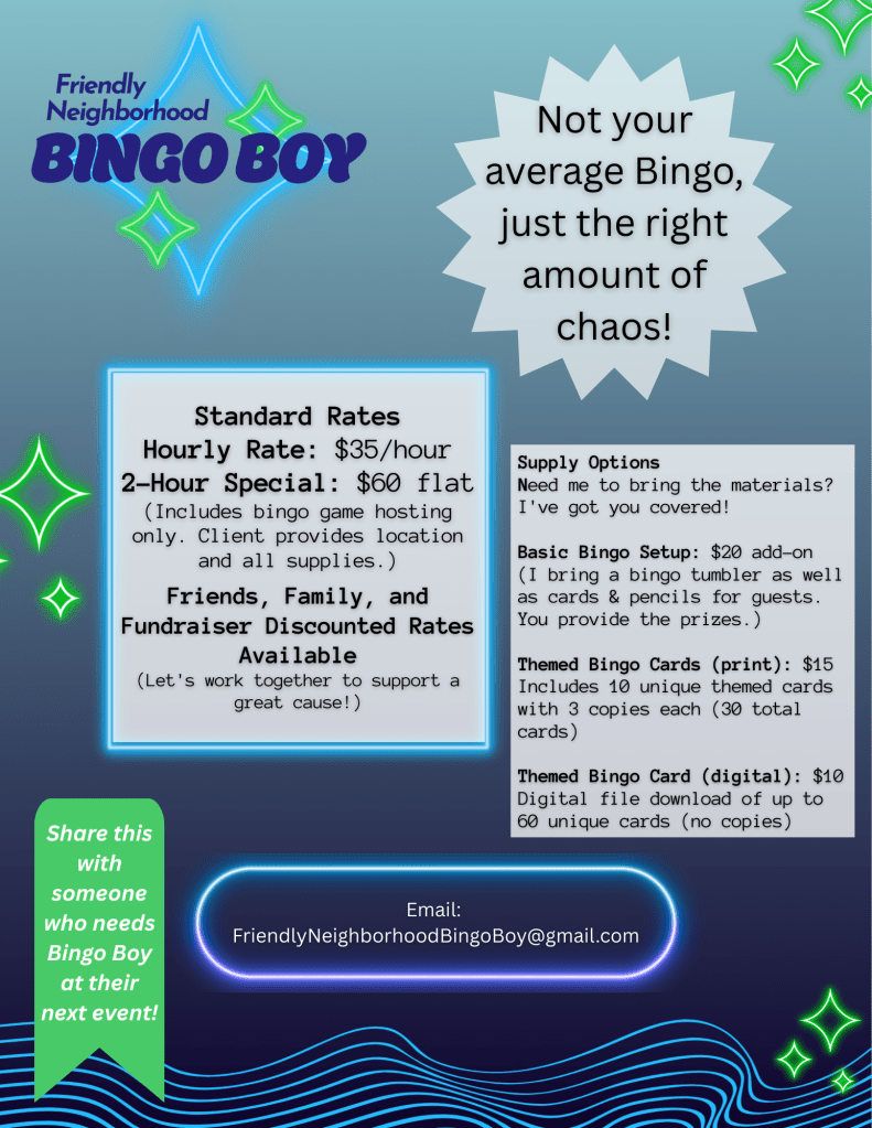 Looking to add energy and fun to your next event? Whether you’re hosting a party, fundraiser, or game night, I bring the excitement of Bingo to life! I’ll keep your guests engaged, entertained, and ready to shout “BINGO!”